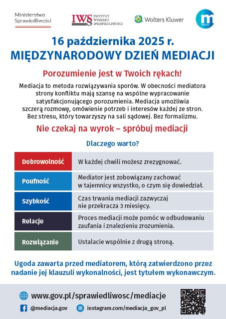 Międzynarodowy Dzień Mediacji i Tydzień Mediacji ma na celu promowanie mediacji jako alternatywnej formy rozwiązywania sporów. Zachęcamy wszystkich do poznania możliwości jakie niesie ze sobą mediacja w postępowaniach karnych i cywilnych. Mediacja to próba doprowadzenia do ugodowego, satysfakcjonującego strony rozwiązania sporu na drodze dobrowolnych negocjacji prowadzonych przy udziale osoby trzeciej.