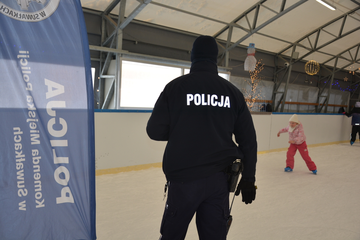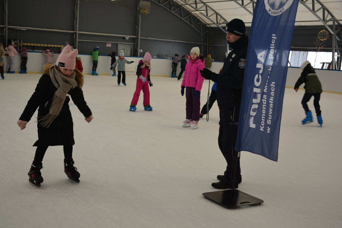 Suwalscy policjanci spotkali się dziś z dziećmi i młodzieżą na lodowisku. Mundurowi spotkanie rozpoczęli od przypomnienia zasad bezpieczeństwa podczas zimowych zabaw. Policjanci opowiadali jak tragiczne konsekwencje może mieć wchodzenie na zamarznięte zbiorniki wodne. Przypomnieli również o noszeniu elementów odblaskowych, których używanie w określonych warunkach jest obowiązkiem osoby pieszej. Policjanci zorganizowali dzieciom turniej łyżwiarski. W zawodach na lodzie udział wzięły wszystkie chętne dzieci. Zwycięzcy turnieju nagrodzeni zostali medalami i dyplomami.