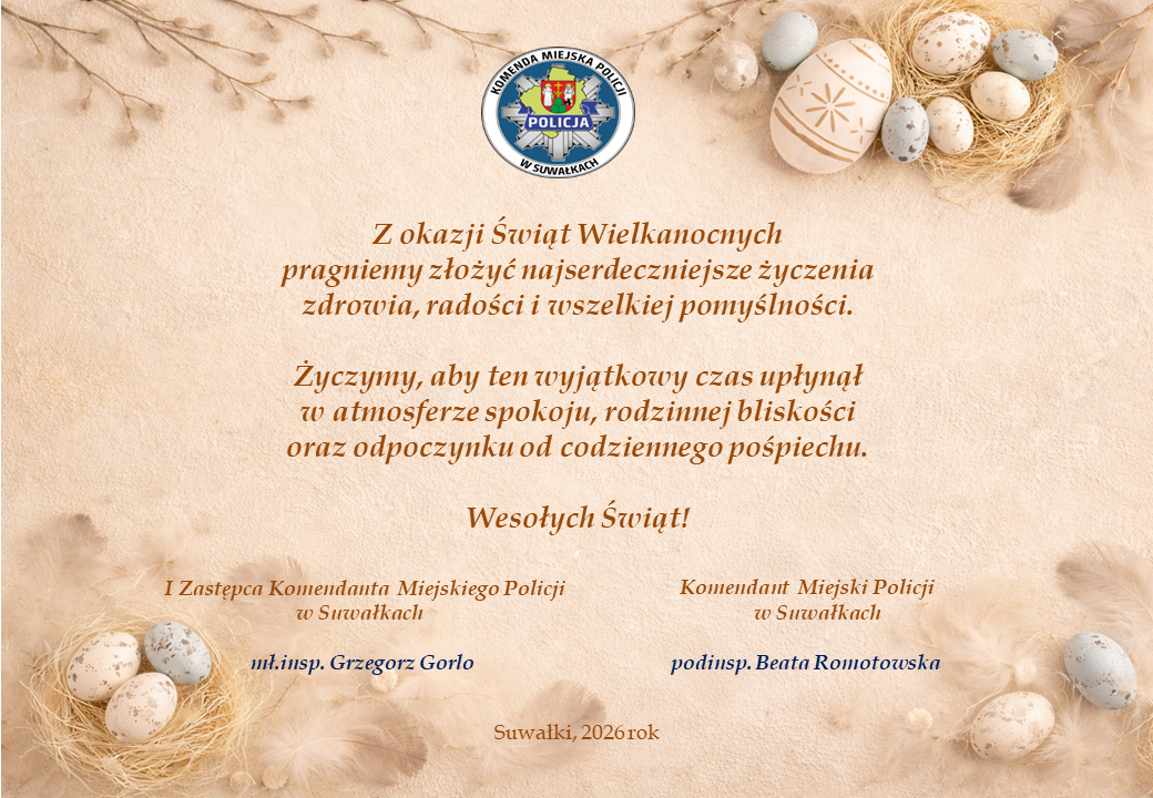 Z okazji nadchodzących Świąt Wielkanocnych Komendant Miejski Policji w Suwałkach podinspektor Beata Romotowska wraz z zastępcą życzą zdrowia, radości i wszelkiej pomyślności. Aby ten wyjątkowy czas upłynął w atmosferze spokoju, rodzinnej bliskości oraz odpoczynku od codziennego pośpiechu. Wesołych Świąt!